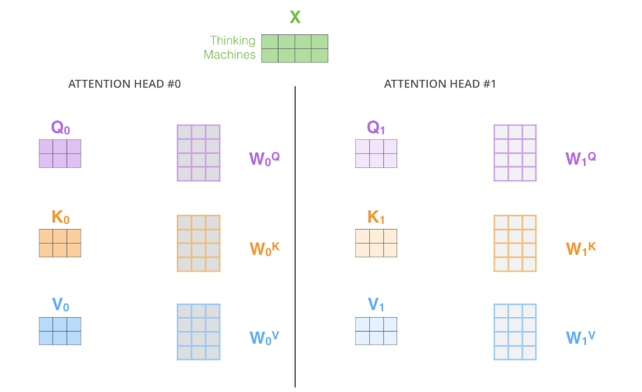那么,一个嵌入向量矩阵,对应多组K,Q,V,就是多头自注意力机制。