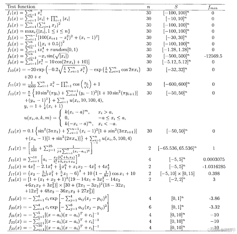 在智能优化算法的性能测试过程中,经常需要借助一些测试函数对算法的全局搜索和局部搜索的性能测试。CEC(国际进化计算会议) 测试函数,常用的23组整理如下:
