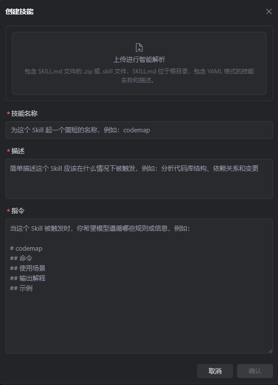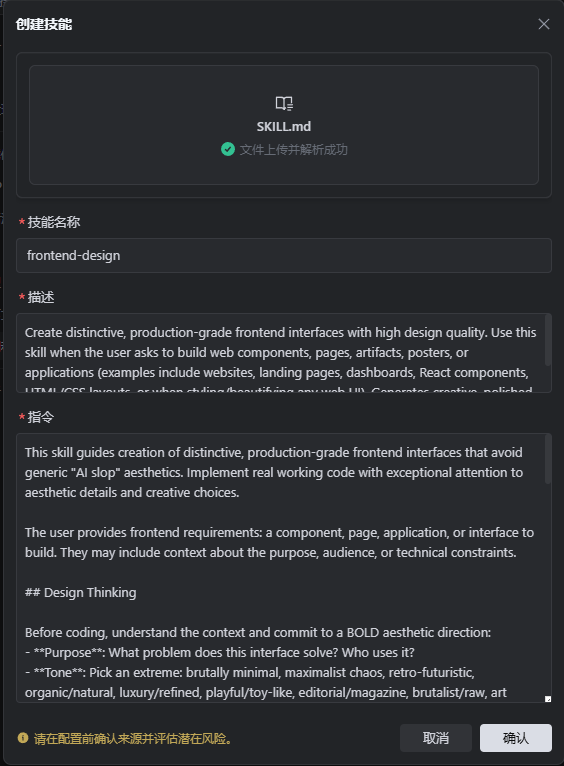 - 找到下载的Skills,上传Skill.md。 trae会自动解析并生成skill。
