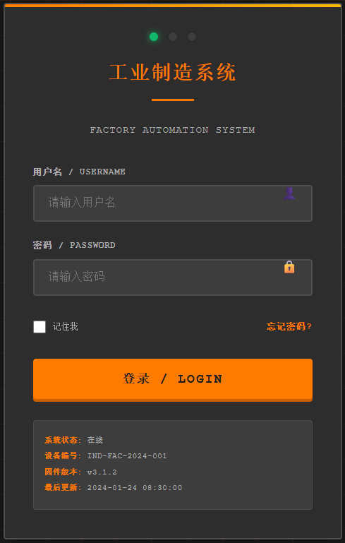 创建一个登陆页面,要求具备工业制造风格,尽量减少交互,将需要交互的内容醒目的展示出来,简单易用,适用于在工厂环境中进行操作。 请使用fronted-design技能进行设计,可以先生成html页面