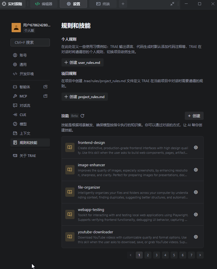 随便创建一个Skill之后,打开TRAE当前的工作目录,会发现有个文件夹.trae\skills文件夹。这个就是当前项目中使用的skills文件的保存位置了。很简单,把下载的所有skills一股脑的copy到这个文件夹下就可以了。再次打开设置的规则和技能,发现所有导入的已经都被识别出来了。