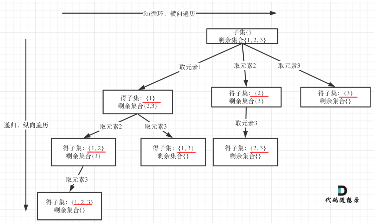 1. backtracking(nums, 0) startIndex=0,不进if for循环 i=0:选1 2. backtracking(nums, 1) startIndex=1,不进if for循环 i=1:选2 3. backtracking(nums, 2) startIndex=2,不进if for循环 i=2:选3 4. backtracking(nums, 3) startIndex=3 >= 3,进if result.push_back([1,2,3]) // 只收集了这个! 返回