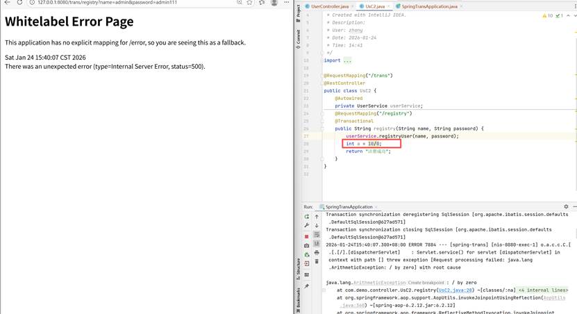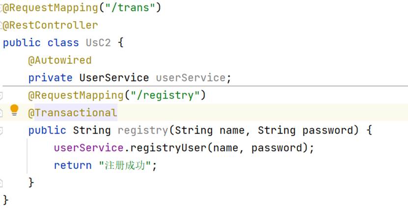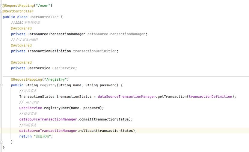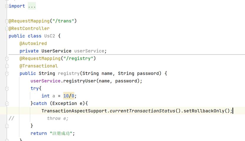 添加完依赖之后,只需要使用注解@Trasactional即可,只要遇到抛异常,那么就会进行回滚事务,如果没有发生异常就会提交