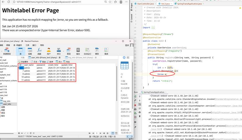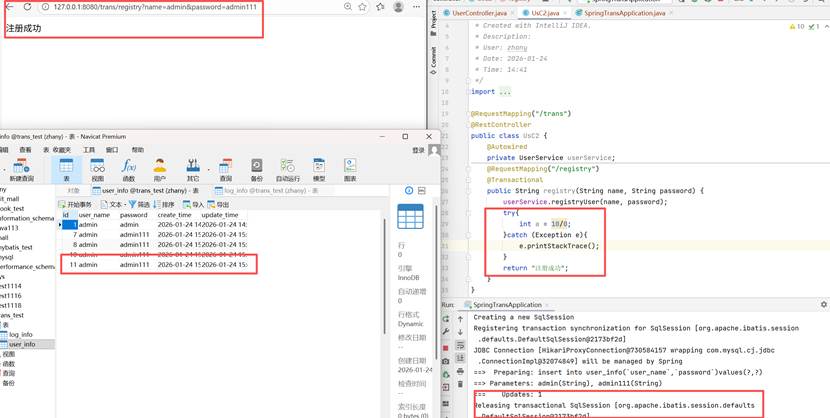 由于我们捕获了异常,但是没有对这个异常进行处理,就会导致这个异常依然存在,最终还是会交给jvm进行处理,所以这个还是无法正常的进行事务的提交