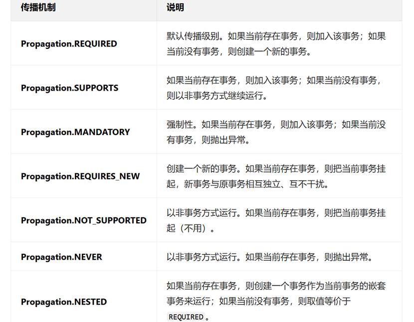 通过@Transactional(propagation =Propagation.REQUIRED)设置事务的传播机制,Spring中的 事务传播级别有7种,重点关注 REQUIRED (默认值)和 REQUIRES_NEW