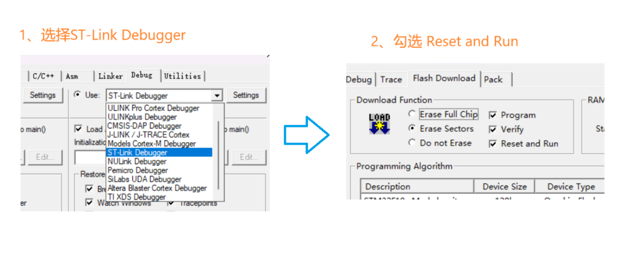 第一步:我们先点击魔术棒按钮,点击Debug选项,将Use选项选为ST-Link Debugger,然后再点击setting按钮,点击Flash Download选项,勾选Reset and run。这样程序一旦下载就会立刻复位并且执行,更加方便。最后点击确定和Ok返回。