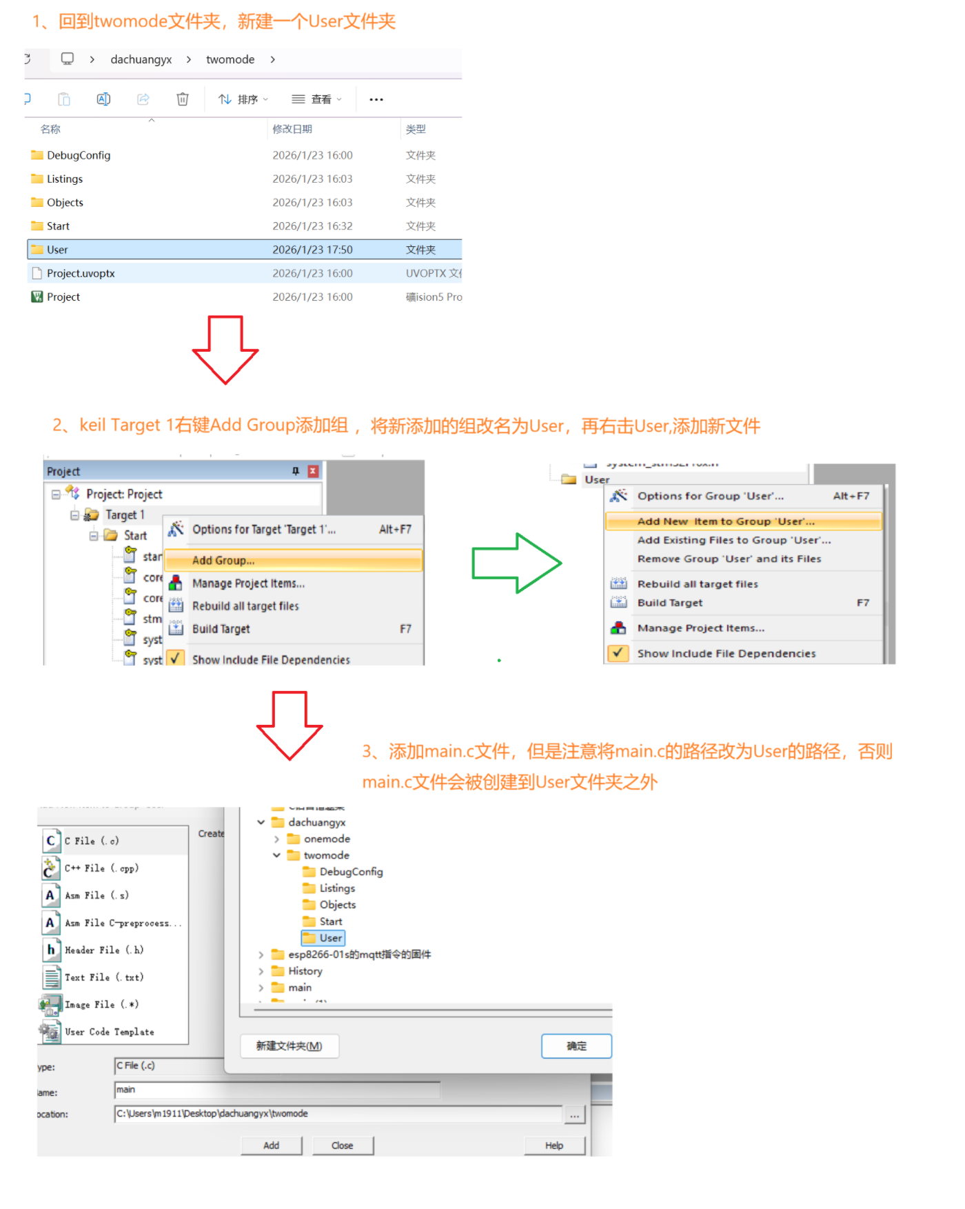第一步:回到twomode文件夹中,新建一个User文件夹,回到keil5软件,右击Target 1 ->Add Group添加组,将新添加的组改名为User,再右击User,添加新文件,为main.c文件,将main.c文件的路径改为User的路径,防止main.c文件被创建到User文件夹之外。