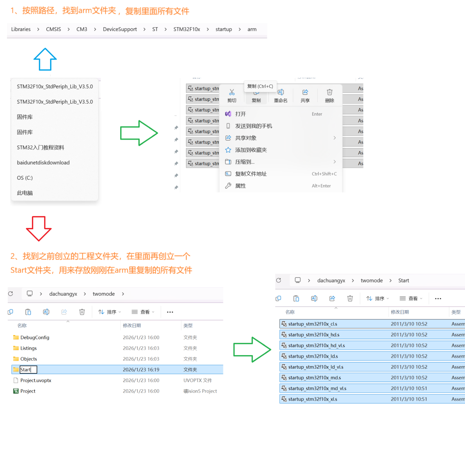 第一步:找到并打开固件库的文件夹,复制里面的所有文件,再回到之前所创立的工程文件夹,新建一个文件夹命名为Start,用来存放刚刚再arm里复制的所有文件。