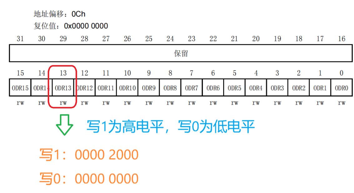 4、给Pin13口输出数据,翻到手册8.2.4,端口输出数据寄存器,ODR13写1为高电平,写0为低电平。