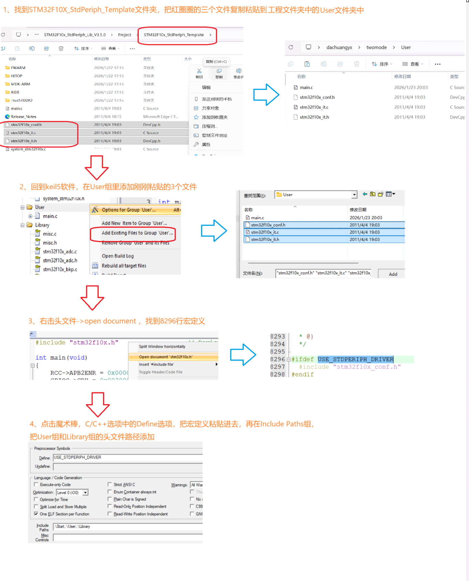 第二步:找到STM32F10X_StdPeriph_template文件夹中红圈圈的3个文件,将其复制粘贴到工程文件夹中的User文件夹中,再回到keil5软件,在User组里添加刚刚粘贴的3个文件,然后再右击头文件,打开文件找到8296行宏定义,接着点击魔术棒中的C/C++按钮,在Define栏把宏定义复制粘贴,最后再在Include Paths栏添加User和Library头文件的路径就行啦。