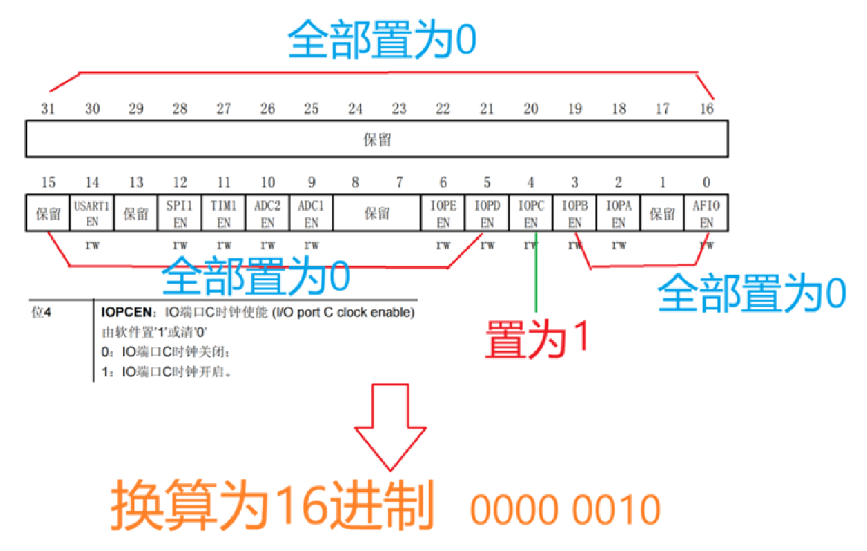 2、这时我们先打开STM32F10XXX参考手册,点击7.3.7章节,查阅手册发现,位4是定义IO端口C时钟使能的,置1时时钟开启,置0时时钟关闭,所以我们给4位置1,其他位全部置0。