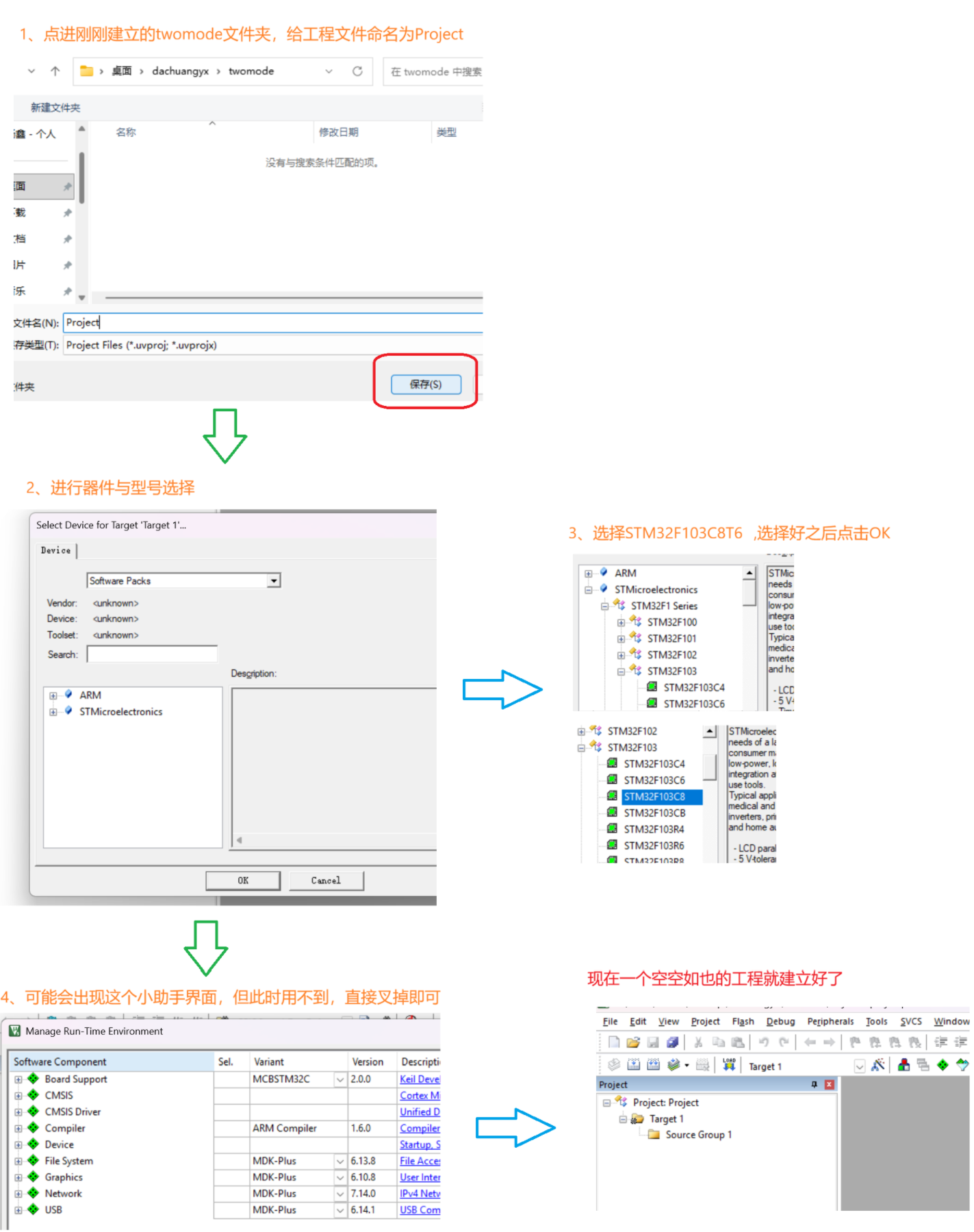 第二步:然后我们点进刚刚建立的twomode文件,接下来给工程文件取一个名字(我这里通用就起一个Project),再点击保存,然后就是选择器件与型号,这里我们所用到的器件型号是STM32F103C8T6(直接选择STM32F103C8即可),点击OK之后可能会出现一个小助手界面,但是此时我们还用不到,就先叉掉,之后就出现一个空空如也的工程界面。