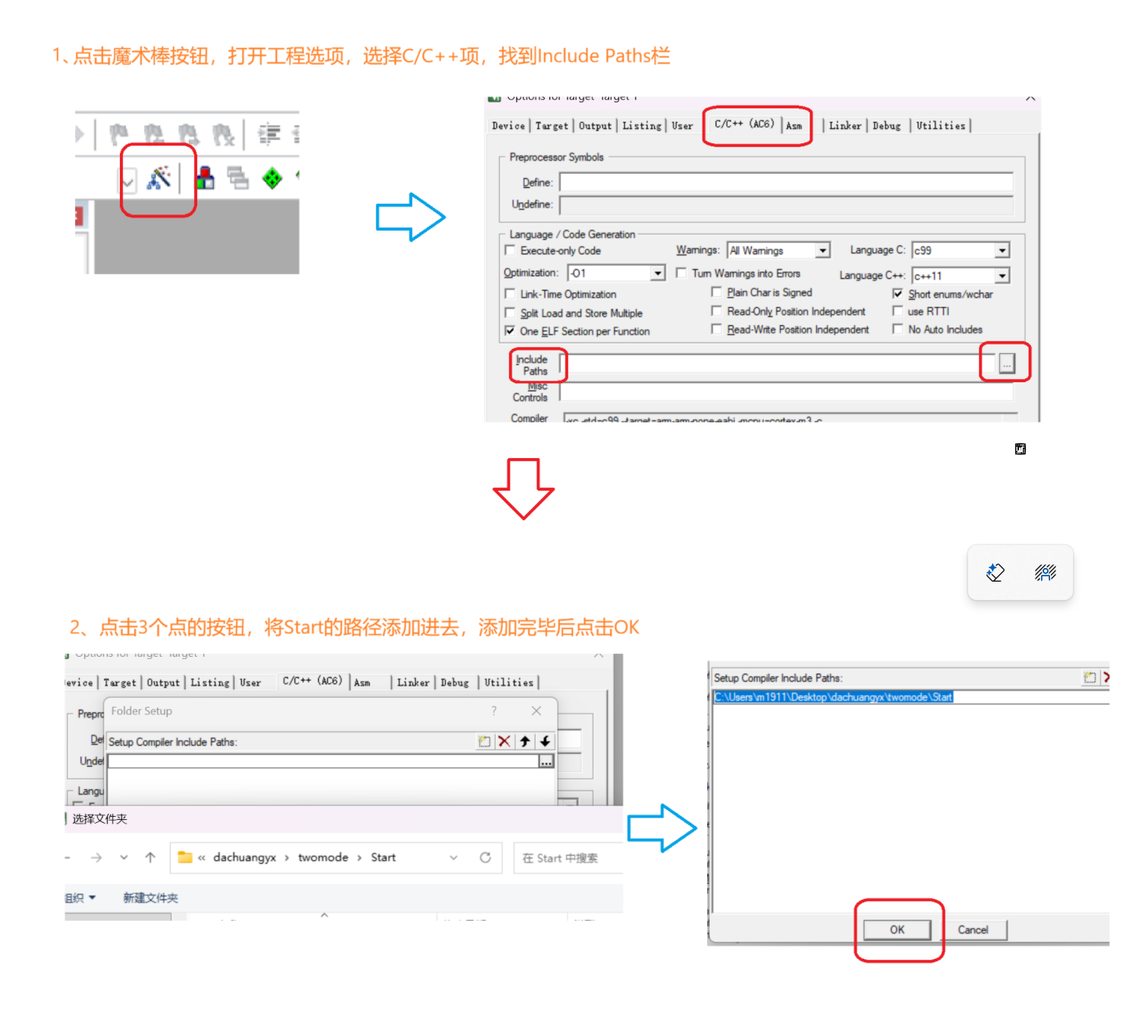 第二步:点击魔术棒按钮,打开工程选项,选择C/C++项,找到Include Paths栏,点击3个点的按钮,将Start组的路径添加进去,添加完毕之后点击OK。