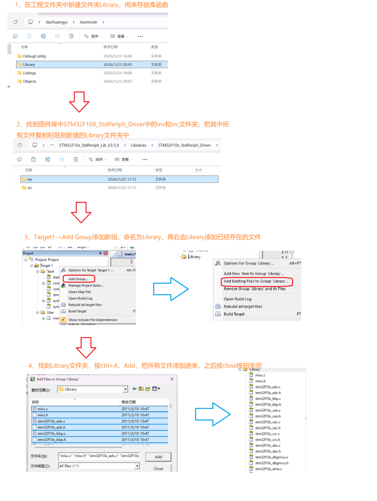 找到固件库中STM32F10X_StdPeriph_Driver中的inc和src文件夹,把其中所有文件复制粘贴到新建的Library文件夹中,接着Target1->Add Group添加新组,命名为Library,右击Library添加已经存在的文件,找到Library文件夹中所有文件,全部添加。