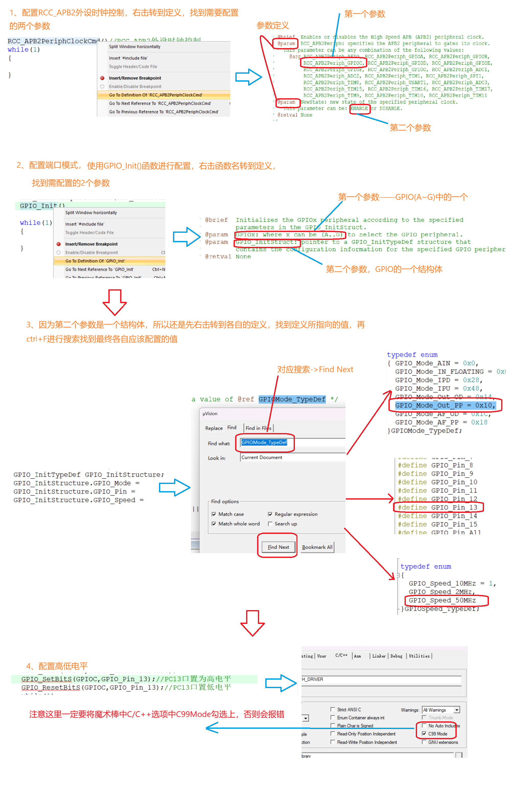 首先配置RCC_APB外设时钟控制,找到需要配置的两个参数,再配置端口模式,使用GPIO_Init()函数进行配置,右击函数名转到定义找到需要配置的两个参数,因为第二个参数是一个结构体,所以先右击转到各自的定义,找到定义所指向的值,再ctrl+F搜索找到最终需要配置的值,再进行高低电平的配置,最后编译程序并将程序烧录到STM32最小系统板中