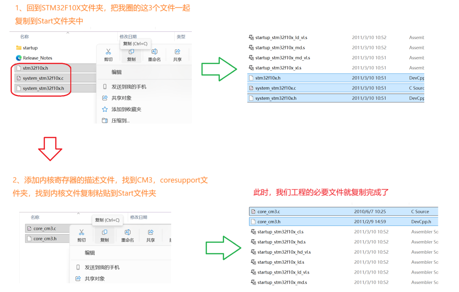 第二步:接着我们再回到固件库的STM32F10X文件夹,把红圈圈的3个文件一起复制到Start文件夹中,然后再找到CM3,coresupport文件夹,把内核寄存器文件也一起复制到Start文件夹中,此时我们工程的必要文件就复制完成了。