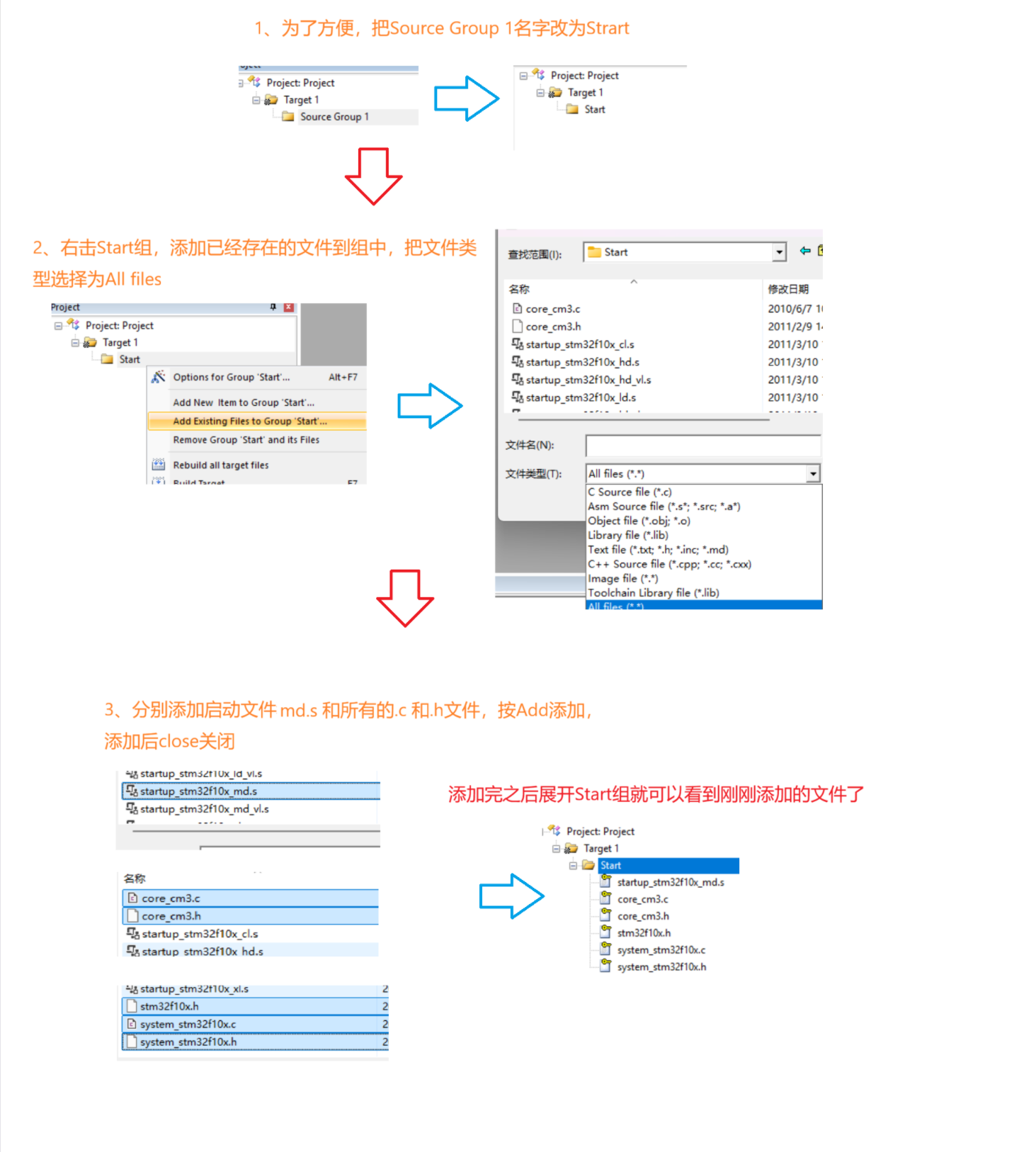 第一步:方便起见,把Source Group1组改名为Start,接着右击Start组,添加已经存在的文件到组中,文件类型选择为All files,然后依次添加启动文件,md.s和所有的.c和.h文件,按Add添加,close关闭,添加完之后就能在Start组中看到了。