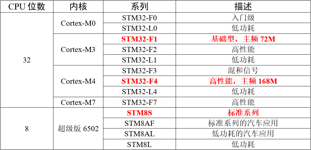 如上表:按CPU位数分为32位STM32系列和8位STM8系列两大类别,其中STM32系列基于不同性能的ARM Cortex-M内核,细分为入门级、基础型、高性能、低功耗等多个子系列,而STM8系列则基于超级版6502内核,涵盖标准、汽车应用和低功耗等子系列,能帮助开发者根据项目的性能、功耗等需求快速匹配对应的产品。