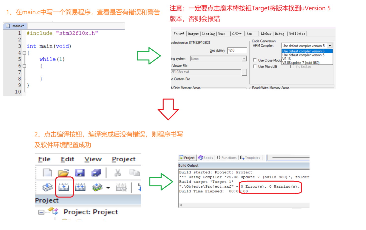 注意:一定要点击魔术棒按钮中的Target项,把编译器版本换到uVersion 5 版本,否则会出现报错!