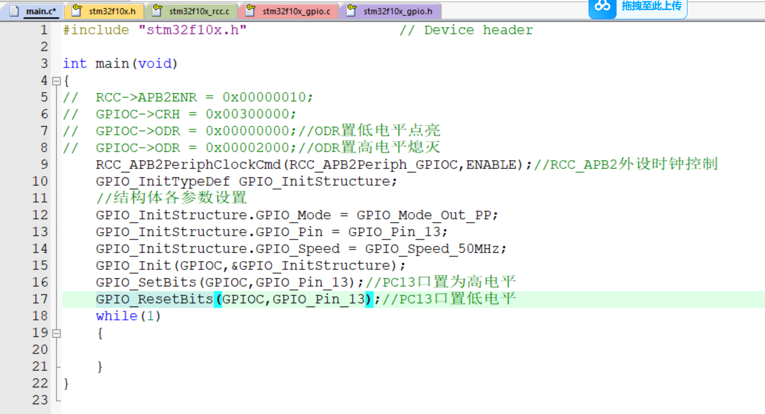 那如何不影响其他端口的原有配置,又能实现PC13口的点灯操作呢?真的有这样的方法吗?我只能说------有的,朋友,有的。这种方式就是通过库函数操作的方式。