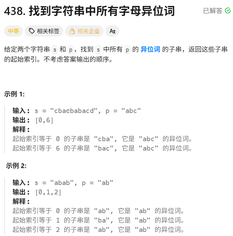 这道题要在字符串s中找到所有是p的异位词的子串,返回这些子串的起始索引。异位词指的是字母相同但顺序可以不同的词,比如"abc"和"bca"是异位词。