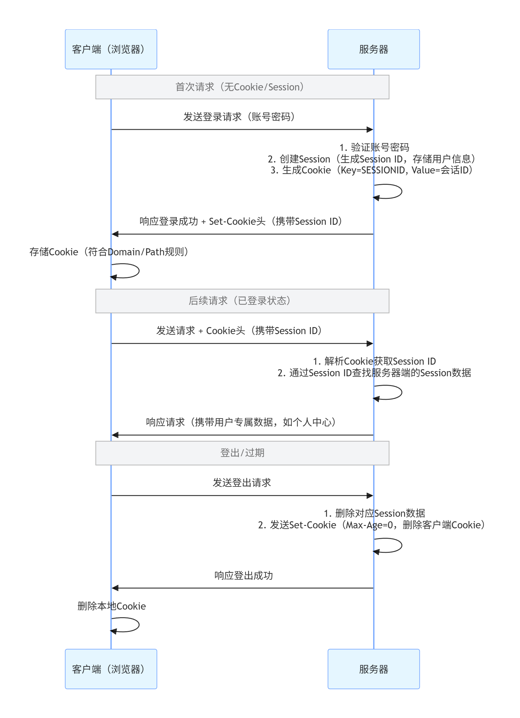 步骤三:客户端接收到从服务器端发来的Session ID 后,会将其作为Cookie 保存在本地。下次向服务器发送请求时,浏览器会自动发送Cookie,所以Session ID 也随之发送到服务器。服务端可通过验证接收到的Session ID 识别用户和其认证状态。