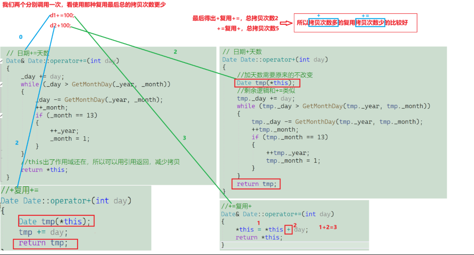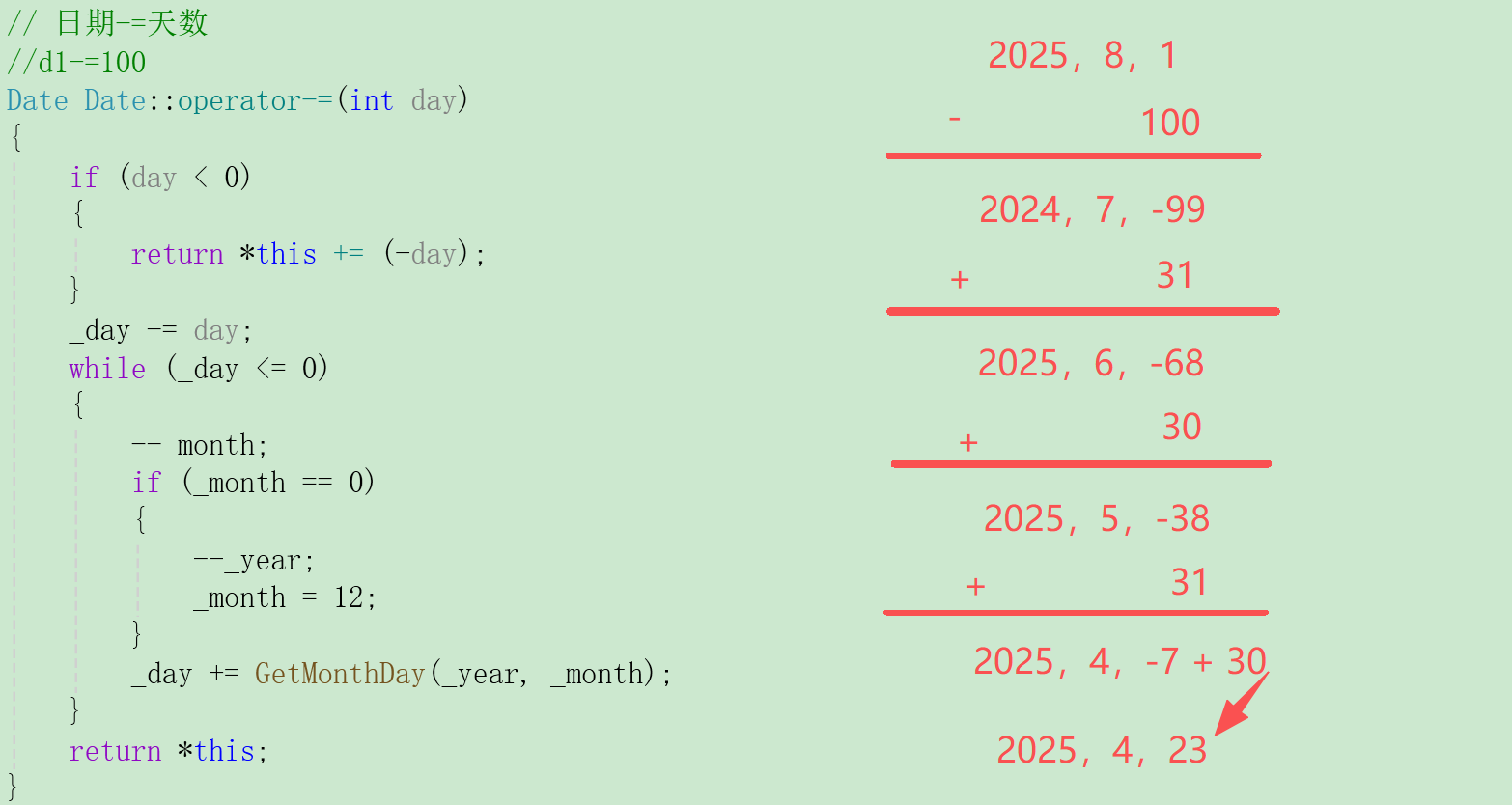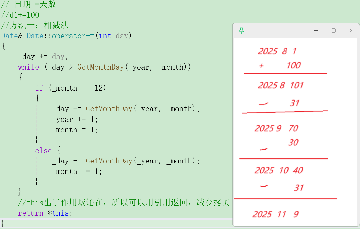 因为 += 传给的值也会改变,所以不需要先拷贝一份。我们直接让当前日期的天数加上给的天数,然后进入循环,直到日期合法为止。在循环里每次减掉当月的天数,再++month。当月份达到13时就++year然后把month置为1。就这样,当循环结束时,返回*this(因为this指针出作用域后还存在,可以使用引用返回)