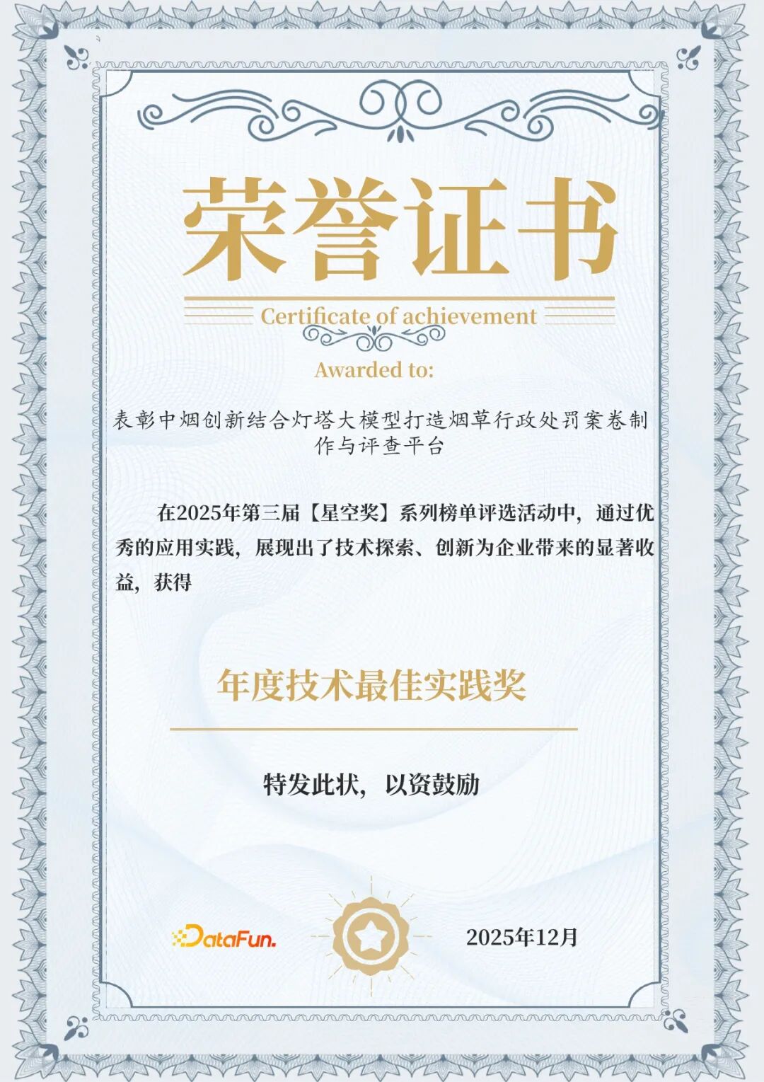 DataFun作为国内数智领域具有重要影响力的技术社区,长期聚焦人工智能与大数据等前沿技术,致力于推动产业知识共享与开放协作。由其发起的"星空奖"系列评选,以梳理年度创新成果、促进产业协同发展为宗旨。其中,"年度技术最佳实践奖"重点关注技术落地与行业场景的深度融合,强调解决方案在应用实效、可复制性及行业推动作用等方面的标杆价值。该奖项要求参评项目不仅具备扎实的技术基础与自主知识产权,更需在真实业务场景中取得可验证的成效。中烟创新智能体解决方案****在本届评选中脱颖而出,获评该项荣誉,标志着其将AI技术与垂直领域执法流程深度结合的实践路径,获得了行业权威认可。