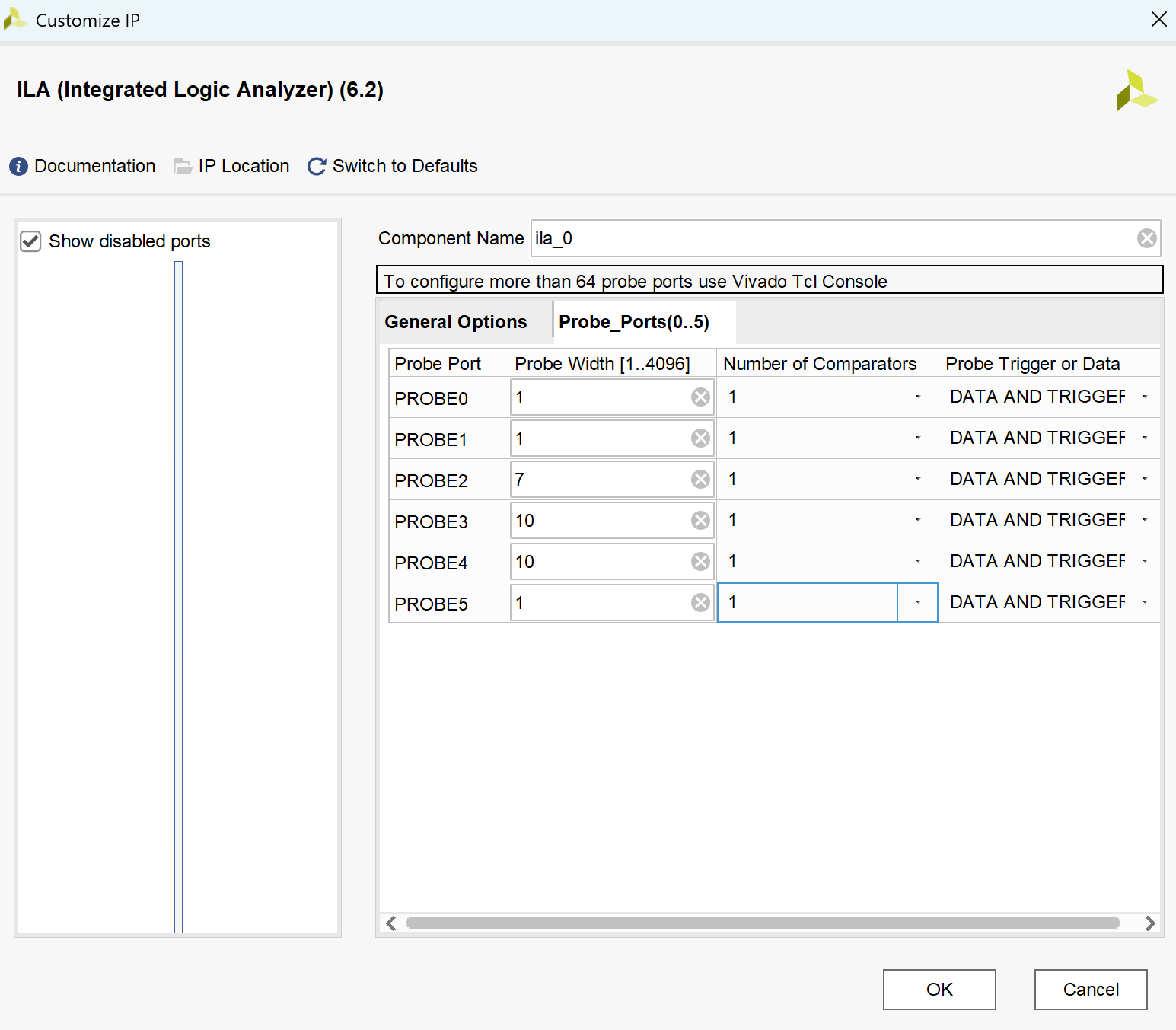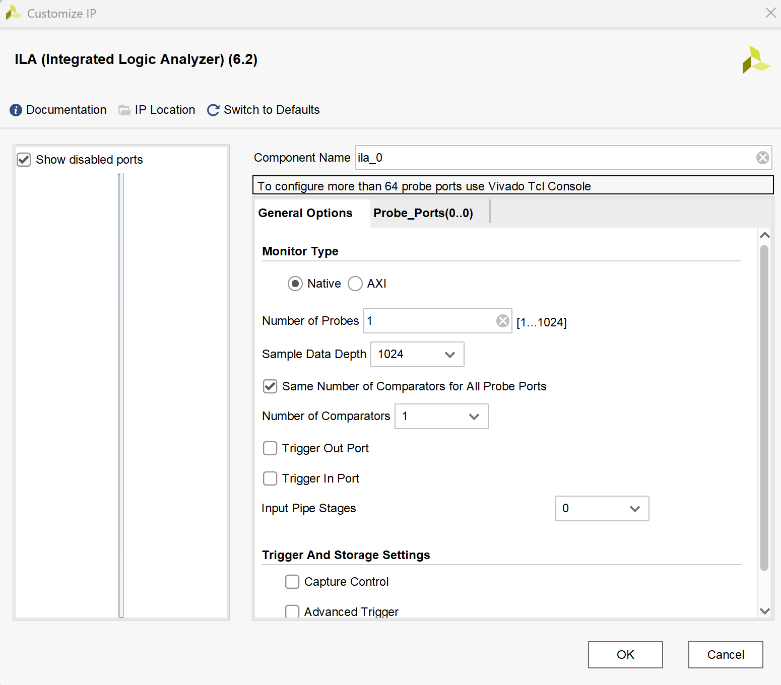 在资源总结页面下滑可以看到资源占用的情况,找到IP Catelog----搜索ILA----双击打开会弹出IP核的配置界面----文档中有产品指南----选择第一个会打开IP核手册,多根据手册去配置。下面是它的配置界面。