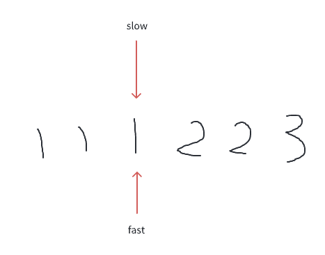 因为数组是排好序的 !这意味着相同的数字一定是挨在一起的,比如: