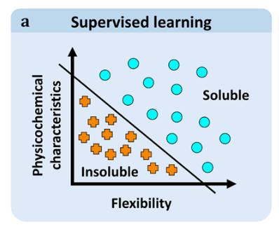 存在几类不同类型的机器学习问题。在监督学习问题中,目标是为每个数据点预测一个特定的属性(称为标签)(图2A)。例如,如果我们试图预测蛋白质的溶解度,每个数据点都可以根据实验结果被标记为"可溶性"或"不溶性"。数据点可以有多个标签,因此一个蛋白质可能有"可溶性"、"来自嗜热生物体"和"球状"等标签。标签可以组成一组类,或落在数值范围内,导致监督学习问题有两个子类型:涉及无固有顺序标签的分类问题(如"可解"或"不可解"),以及涉及数值标签(如蛋白质产率)的回归问题。
