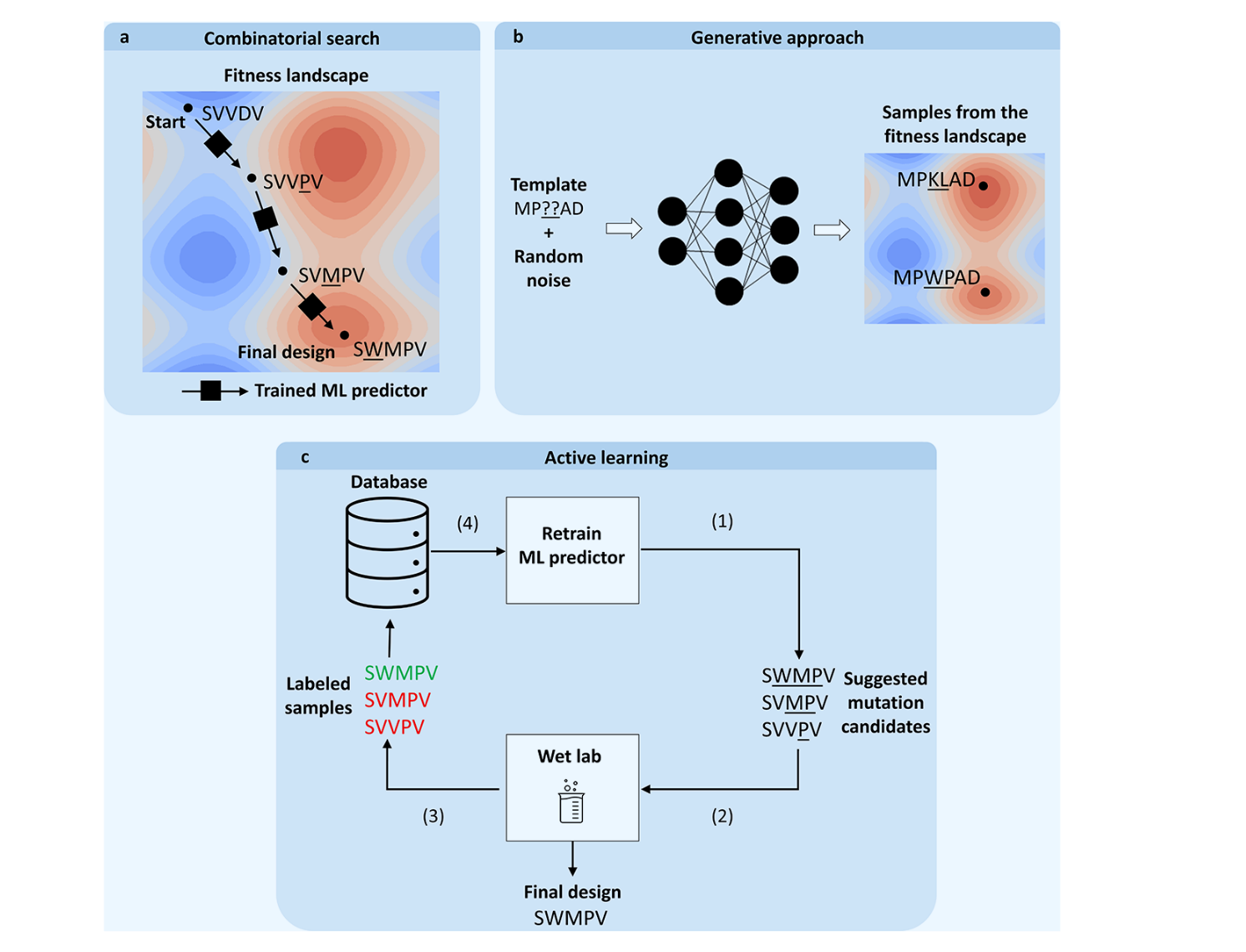 虽然近年来预测突变效应的工具日益先进,但它们的简单形式只能为特定置换提供标签。然而,蛋白质工程流程的期望结果是拥有一份有前景的蛋白质变异样本清单,用于实验验证。因此,即使有可靠的机器学习工具用于预测替代效应,也必须解决提出有前景假设设计的问题。这个问题可能成为一个主要瓶颈,因为即使预测单点或多点突变效应很快,评估所有可能的突变组合仍然不可行。因此,对能够同时预测突变影响和缩小搜索空间的工具需求日益增长,这也是本小节的重点。
