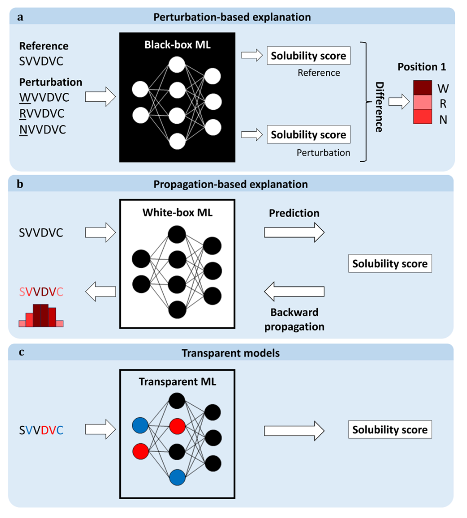 越来越多地应用于蛋白质工程的机器学习方法通常复杂且难以解释。由于机器学习设计的蛋白质和酶的湿实验室验证成本高且耗时,加强人工智能辅助蛋白质工程的信誉至关重要,并确保实验者能够确信这些方法能产出有良好成功率的设计。XAI通过提供对蛋白质工程中机器学习模型决策过程的洞见,可以增强公信力。323 它还能帮助科学家通过揭示错误和偏差来改进算法。因此,近年来利用XAI解释深度学习网络,吸引了药物发现、化学和蛋白质工程等领域的关注,包括主动配体搜索,325 预测酶EC数,326,并识别显示GPCR受体活跃与非活性状态转变的残基。