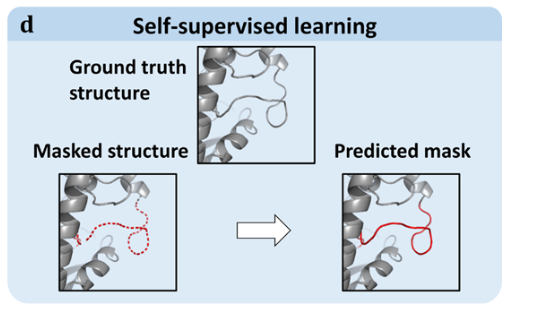 与序列数据库的爆炸式增长同步,蛋白质数据库在2023年4月达到了20万条条的里程碑,为自我监督的蛋白质结构学习提供了丰富的实验结构数据来源。许多深度学习模型已被拟合到PDB数据的大部分子集,以利用蛋白质结构的自然多样性。例如,MutCompute 在一个非冗余的 19K 蛋白质样本上训练,基于局部三维环境预测人工掩蔽的残基,使模型能够成功捕捉与蛋白质稳定性相关的表型景观。31 此外,Zhang 等人设计了多个通用任务用于图神经网络蛋白质结构的自监督预训练,从而提升了多种下游任务的性能。68 蛋白质上的自监督学习结构还被用来建议特定主链的蛋白质序列,并生成全新蛋白质结构。