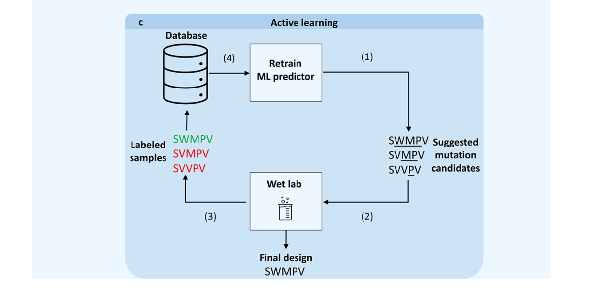虽然计算机模拟优化方法支持迭代生成有前景设计,但它们完全依赖预测变量正确评分突变景观中任一点的能力,这可能是个不切实际的强假设(非常认可这个观点 。另一种可能的替代方案(尽管成本更高且吞吐量更低)是直接将实验验证纳入优化循环。这种实验输入可以引导搜索算法找到突变景观中更有前景的部分,类似于定向进化。虽然此类高级搜索方法此前已被用于改进传统定向进化,但它们并未充分发挥实验特征描述中间变异的潜力。基于机器学习的主动学习方法通过迭代提取所有特征变体中的知识并挑选最有前景的变体,加速定向进化。依赖新的实验数据,只能预期有限数量的训练样本,这使得机器学习模型的选择限制在参数数较少的模型中,如多层感知器(MLP)仅有两层。主动学习领域的最新进展是GFlowNets的开发,该网络旨在在机器-专家循环中推荐多样且准确的候选方案,加速科学发现。使用此类网络的研究已证明其在设计小分子方面的潜力;然而,蛋白质设计的实用性仍需可靠验证。