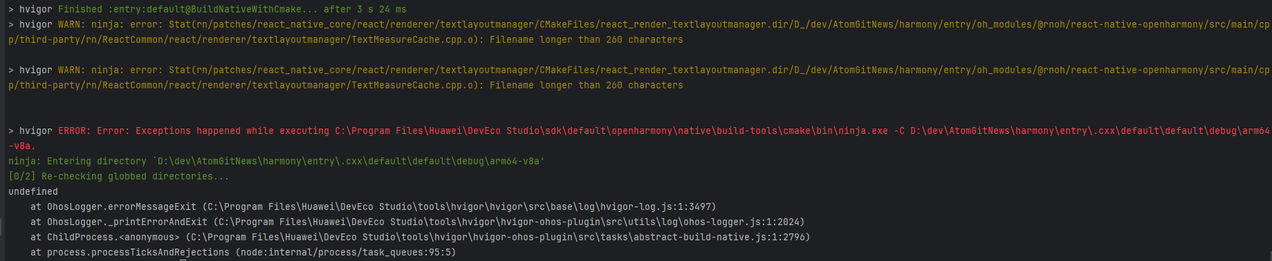 遇到这个问题不用怀疑自己的工程放置的位置是不是太深导致,root cause是oh_modules依赖库的路径太深的原因,所以必须解决长路径问题,解决方式包括2个关键点,第一个关键点是让系统支持长路径,这个可以通过配置windows系统的注册表解决,第二个关键点是更新ninja版本,目前IDE自带的Ninja版本是1.12.0,通过将Ninja版本更新到1.13.2后问题才能解决。