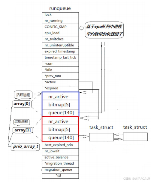 过期队列和活动队列结构⼀样。过期队列上放置的进程,都是时间片耗尽的进程。