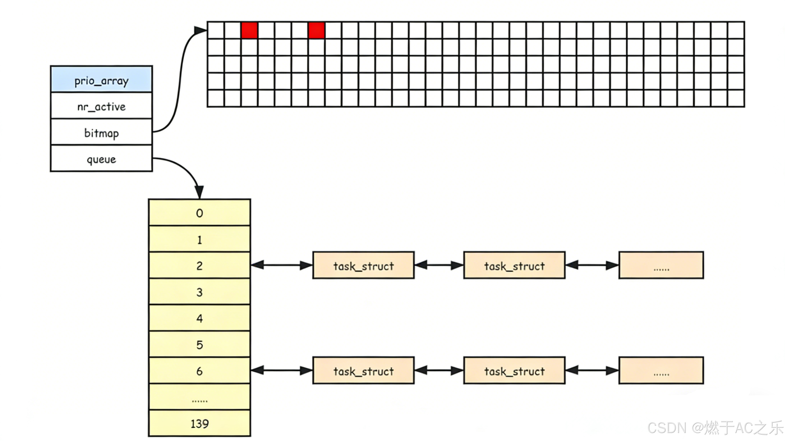 queue[140]: ⼀个元素就是⼀个进程队列,相同优先级的进程按照FIFO规则进行排队调度,所以,数组下标就是优先级。
