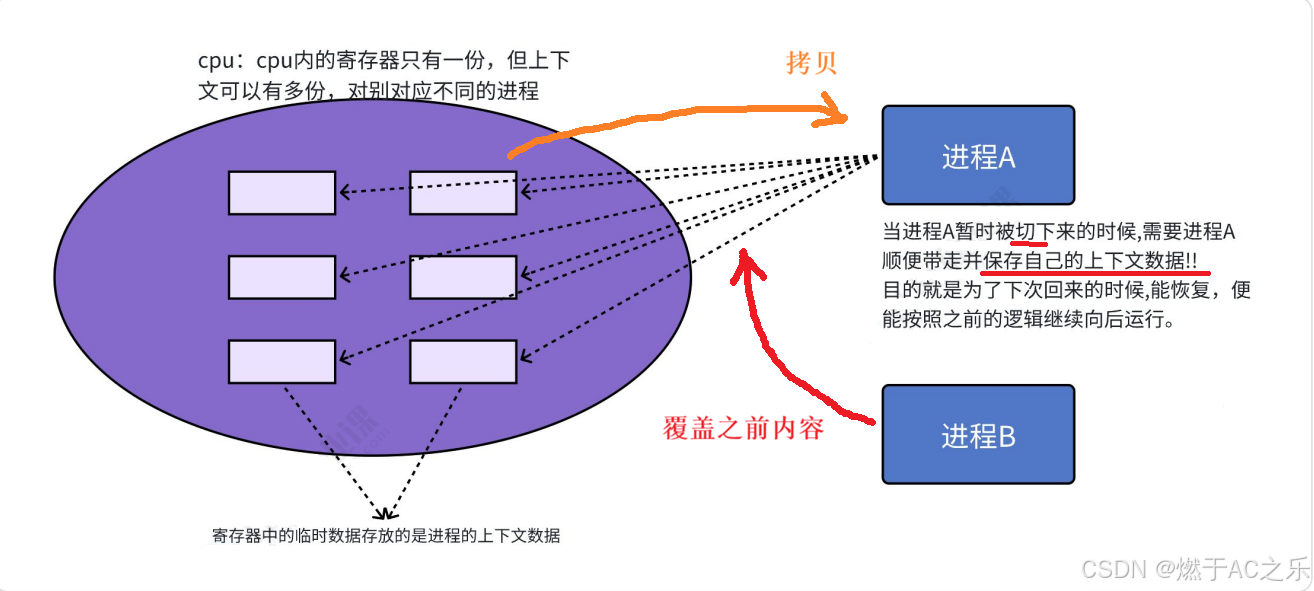 进程切换:最核心就是保存和恢复当前进程的硬件上下文数据,CPU寄存器的内容。