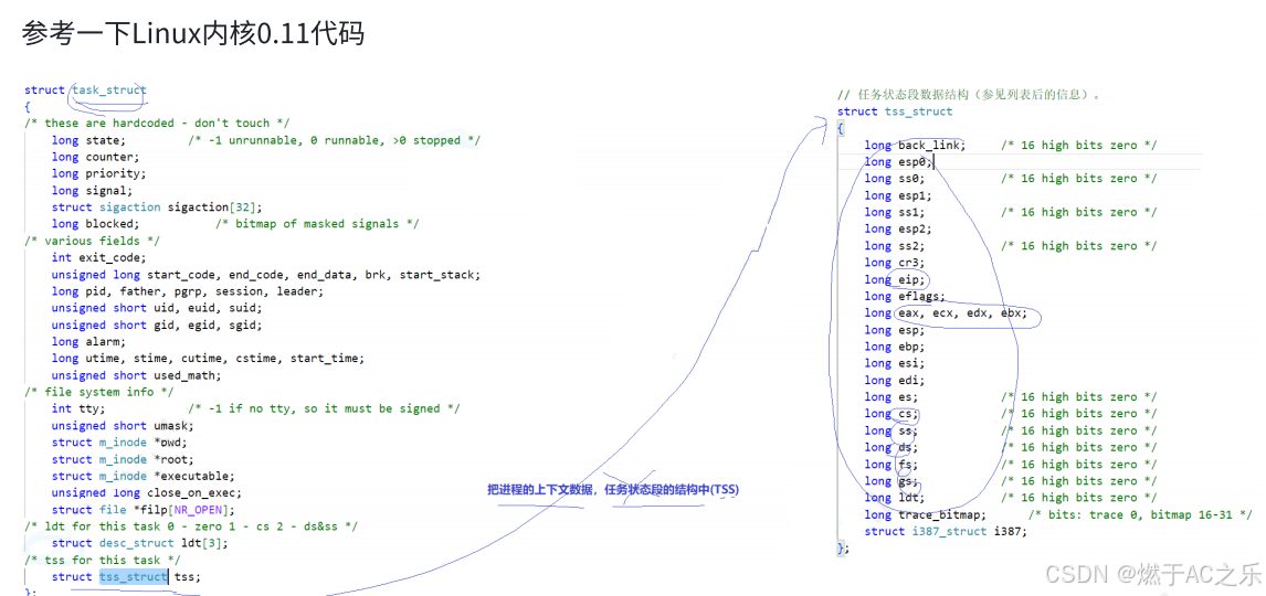 拷贝到进程A的task_struct: tss(任务状态段)。