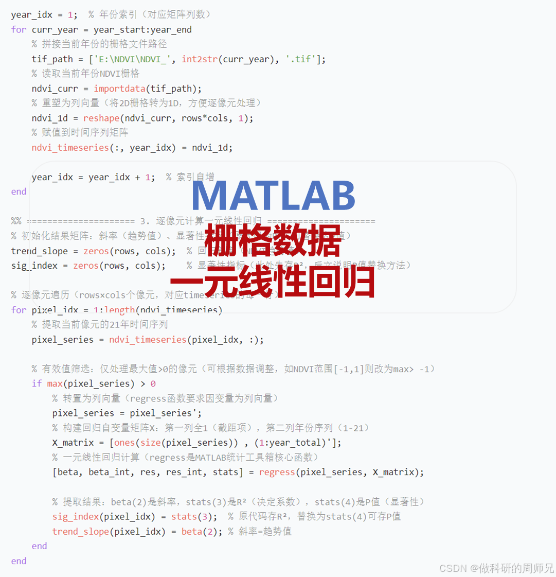 reshape(ndvi_curr, rows*cols, 1)------ 将二维栅格(行 × 列)重塑为一维列向量,目的是把 "空间维度" 的像元转为 "行","时间维度" 的年份转为 "列",方便逐像元(逐行)处理时间序列; - 为什么不用循环逐像元读取?------ 批量读取后重塑矩阵,比嵌套循环逐像元读取效率高 10 倍以上!