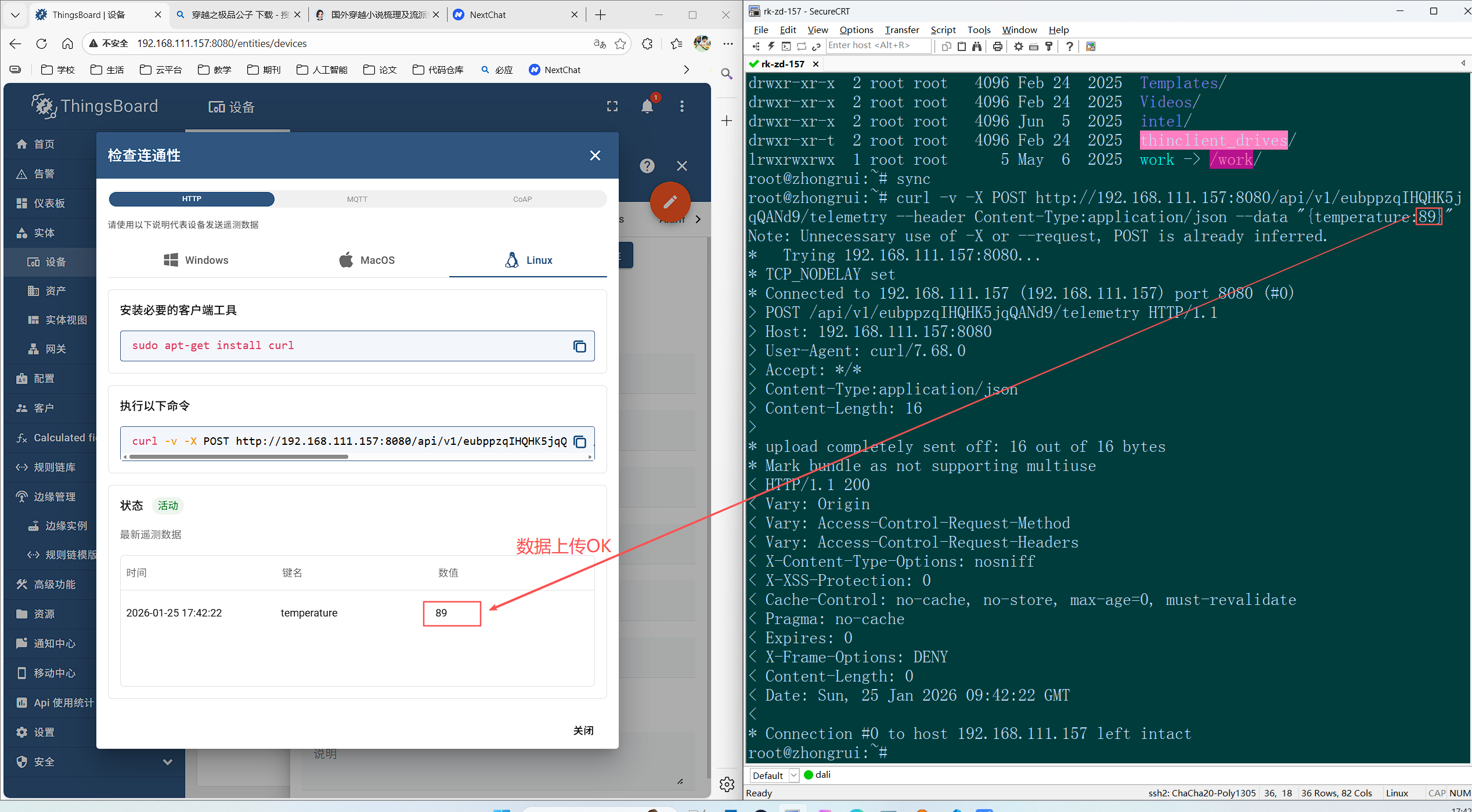 root@zhongrui:~# curl -v -X POST http://192.168.111.157:8080/api/v1/eubppzqIHQHK5jqQANd9/telemetry --header Content-Type:application/json --data "{temperature:89}"