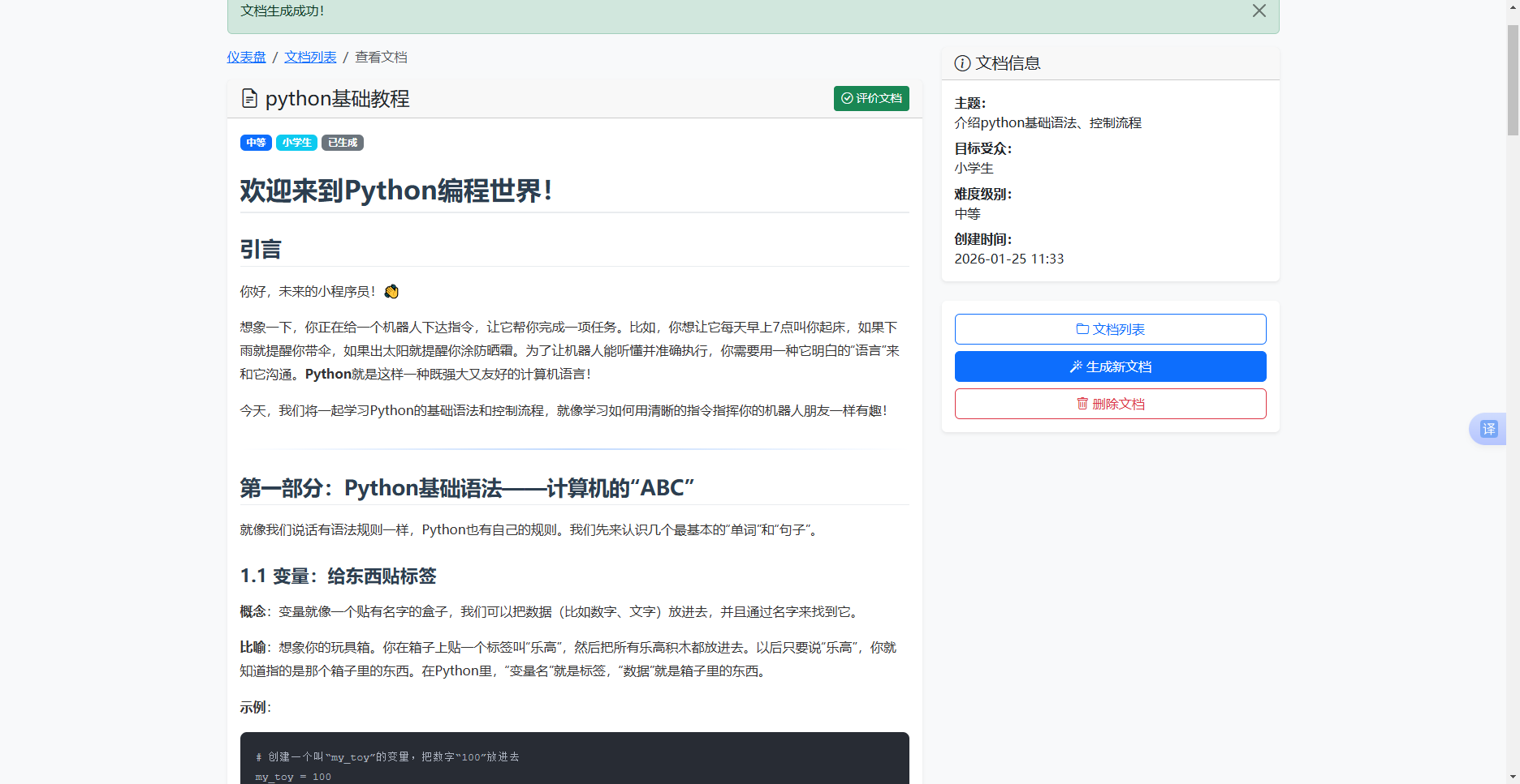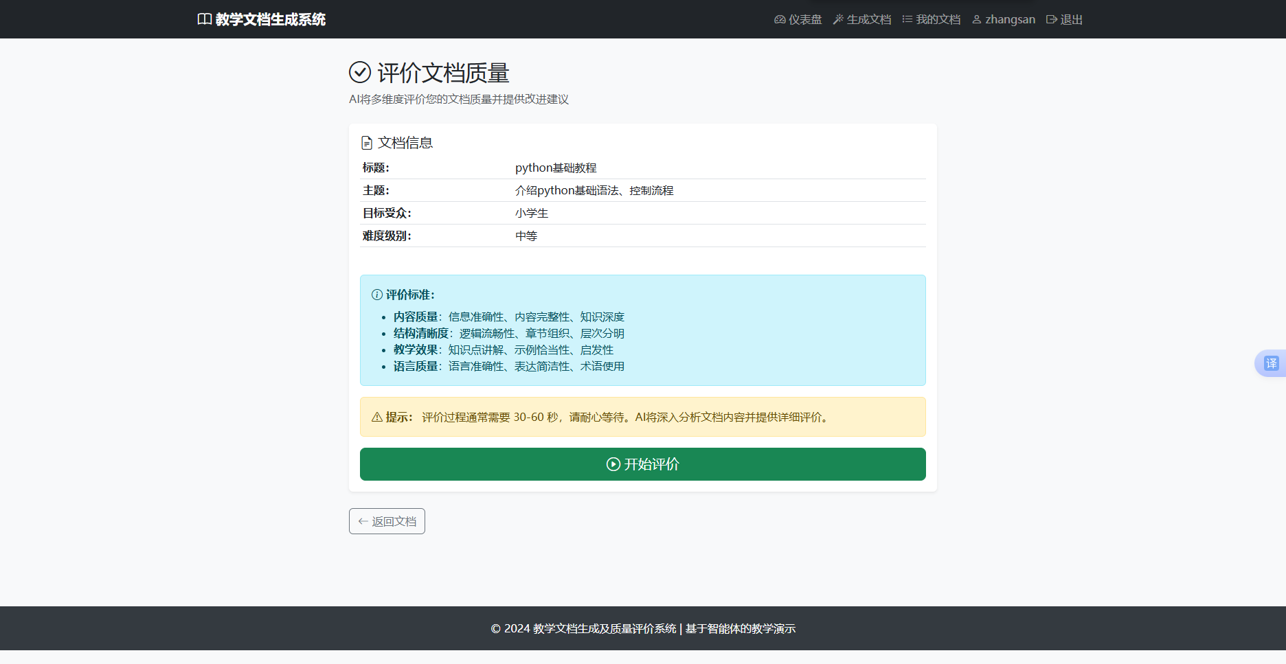 系统提供智能化的文档质量评价功能,从内容质量、结构组织、清晰度、完整性、教学价值五个维度进行量化评估。评价过程由大语言模型分析文档内容,自动生成详细评分(0-100 分)和改进建议。评价耗时约 30-60 秒,用户可根据评价结果优化文档质量。评价结果永久保存,便于历史回顾和质量追踪。