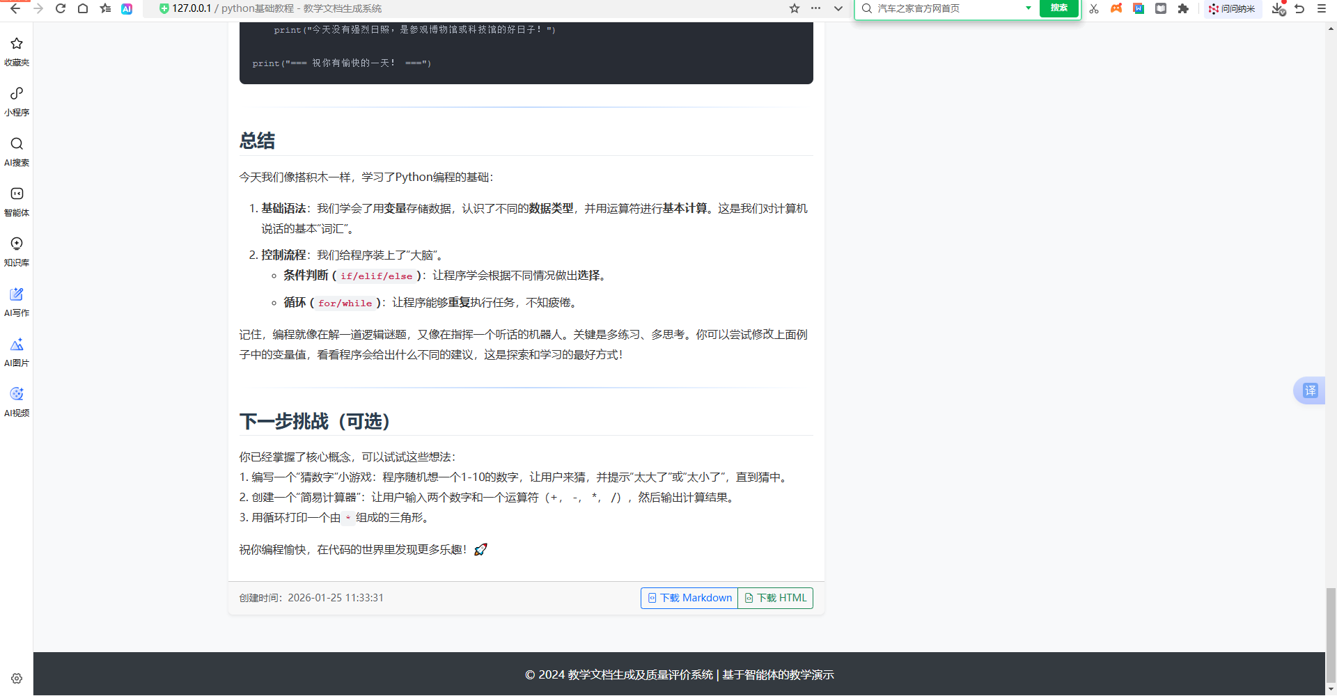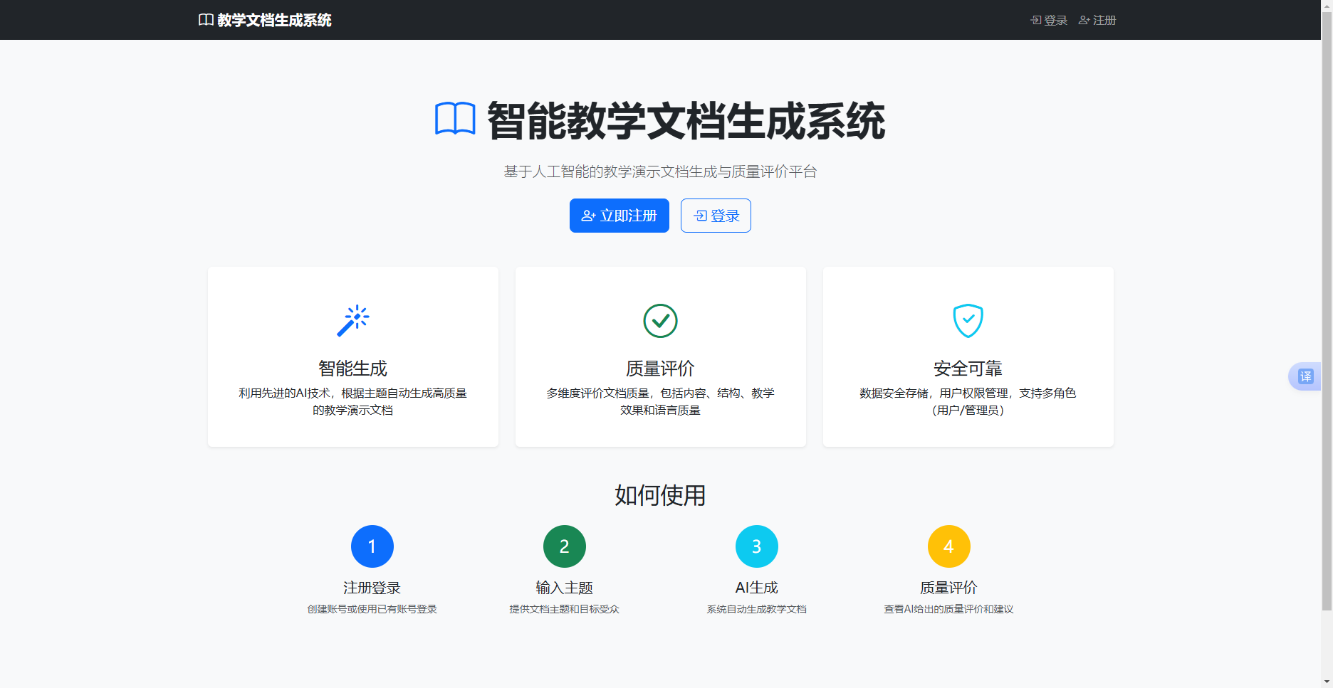 本系统是一个基于 Flask 框架开发的智能化教学文档生成与质量评价平台,集成了 DeepSeek 大语言模型实现自动化文档生成和多维度质量评估。系统采用 Flask-Login 实现用户认证,SQLite 作为数据存储,Bootstrap 5 提供响应式前端界面。系统支持用户和管理员两种角色,用户可根据教学需求生成定制化文档并进行质量评价,管理员可通过管理后台对用户、文档和评价进行全面管理。系统文档采用 Markdown 渲染,支持代码高亮、表格展示和格式化下载,为教育工作者提供高效的教学内容创作工具。