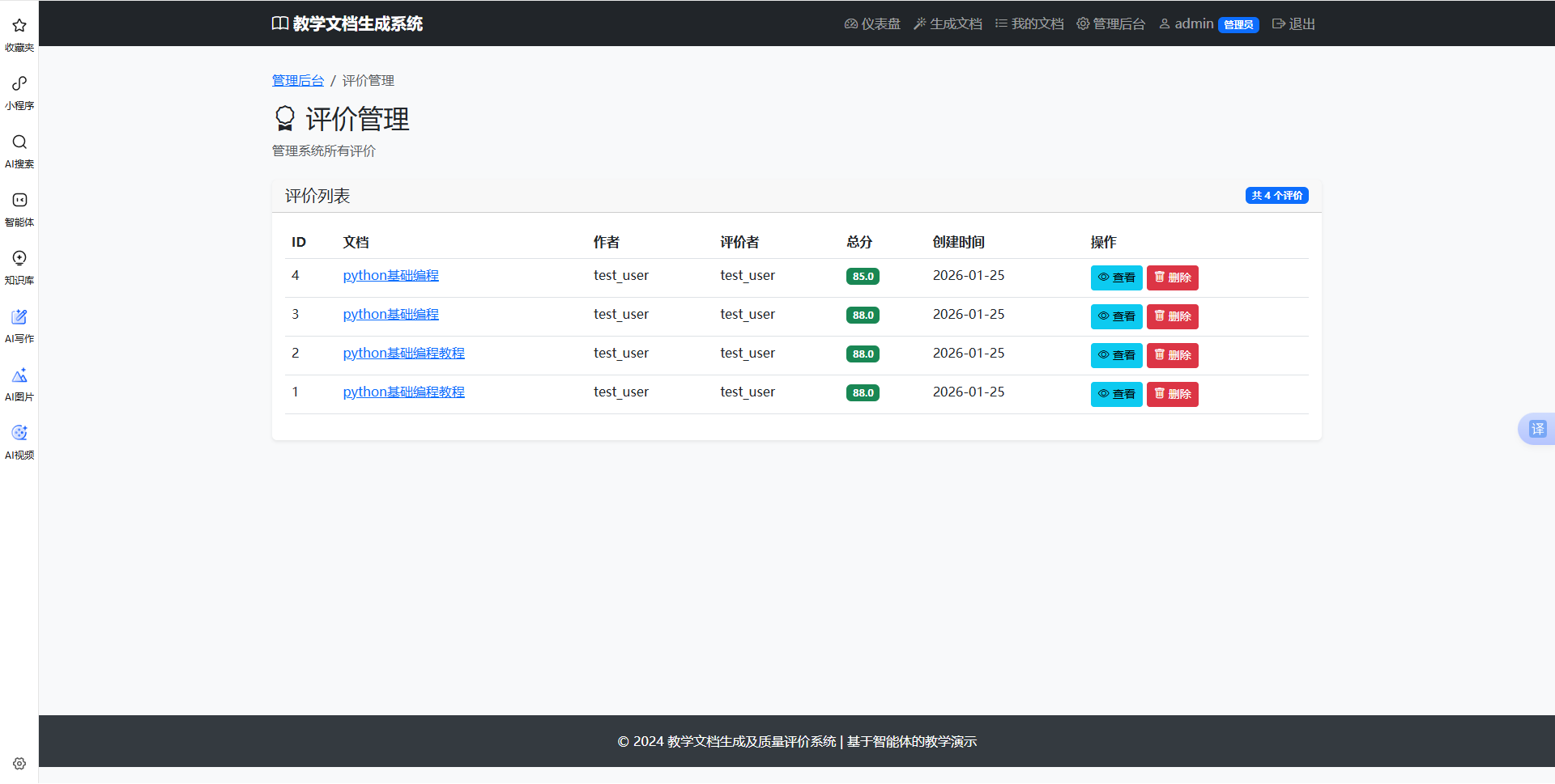管理员可查看系统中所有文档的评价记录,包括评价文档、评价分数、各维度评分、反馈意见和评价时间。支持评价删除操作,删除评价后文档状态自动恢复为"已生成",允许用户重新评价。评价列表按评价时间倒序排列,管理员可分析评价数据了解文档质量分布。评价管理功能有助于监控评价质量,确保评价结果的准确性和公平性。