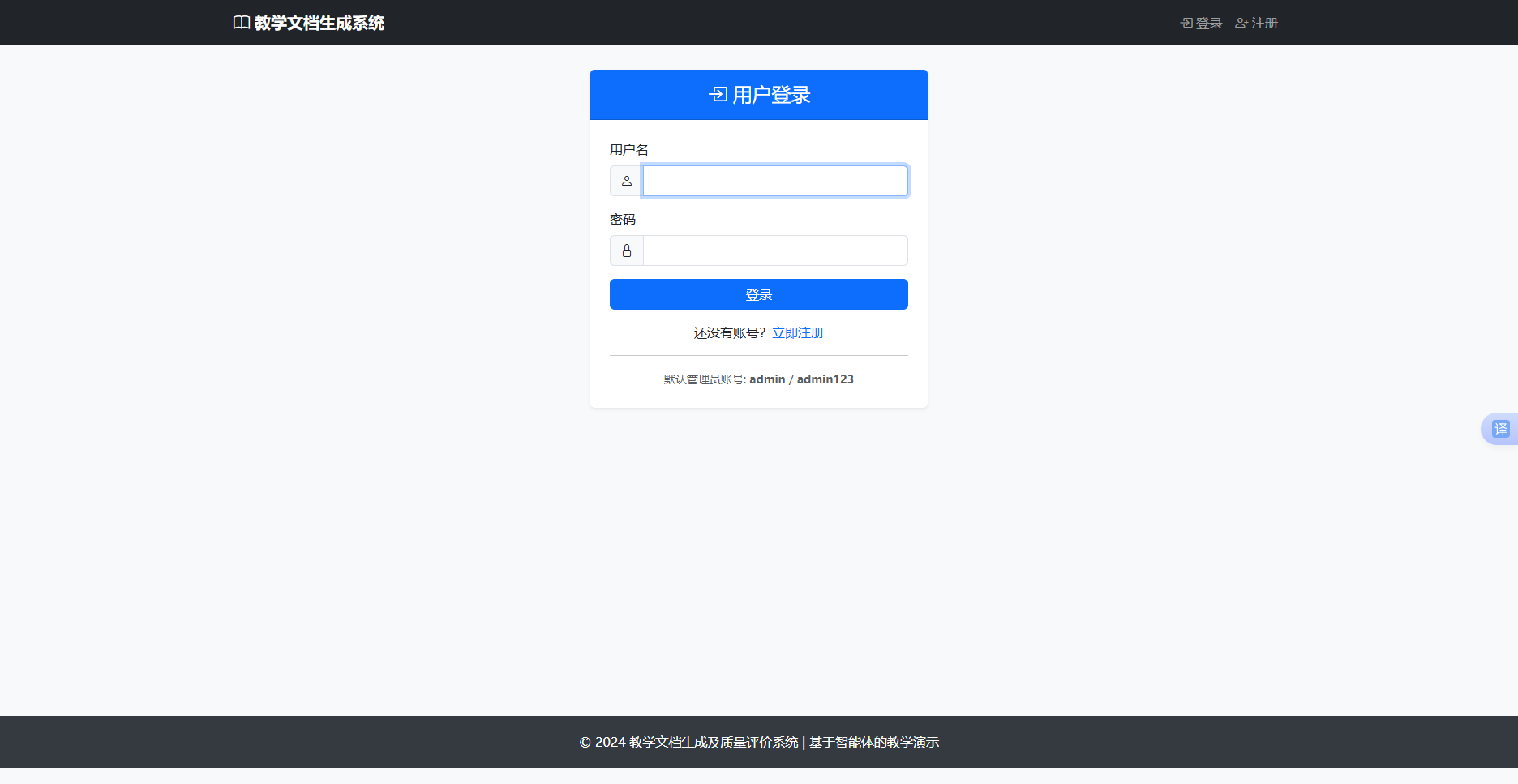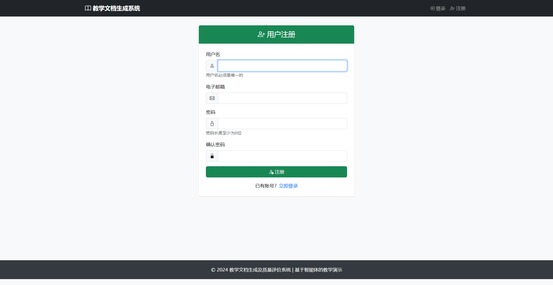 系统提供完善的用户注册和登录功能,支持用户名和邮箱注册。注册时需要设置密码,密码经过加密存储。登录功能集成 Flask-Login 实现会话管理,支持记住登录状态。用户登录后可访问文档生成、质量评价等核心功能。系统预置管理员账户(admin/admin123),方便系统管理和维护。注册信息包括用户名、邮箱和密码,通过表单验证确保数据有效性。