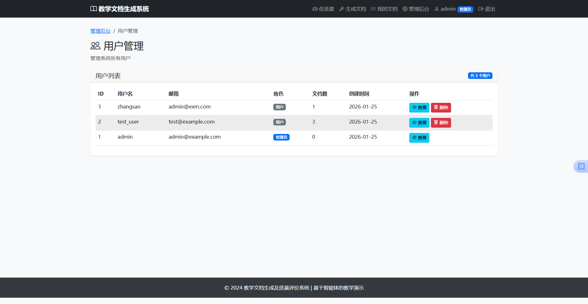 管理员可在管理后台查看所有注册用户信息,包括用户名、邮箱、角色、注册时间和文档统计。支持查看用户详情页面,显示该用户的所有文档和评价记录。管理员可以删除普通用户账户(不能删除管理员),删除用户时同步删除其所有关联文档和评价,确保数据一致性。用户列表支持分页显示,每页显示 20 条记录。