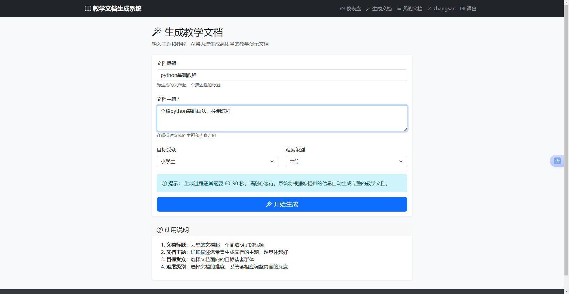 用户可输入教学主题、目标受众、难度等级等参数,系统通过 DeepSeek 大模型自动生成结构化教学文档。文档包含教学内容、知识点、实例和练习等模块。生成过程采用异步处理,前端显示实时进度,整个过程约需 60-90 秒。生成的文档支持 Markdown 格式预览,内容经过语义理解和教学逻辑优化,确保教学文档的专业性和可读性。