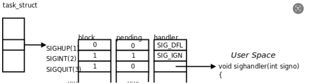 3、handler表(函数指针数组):记录每种信号的处理方法。