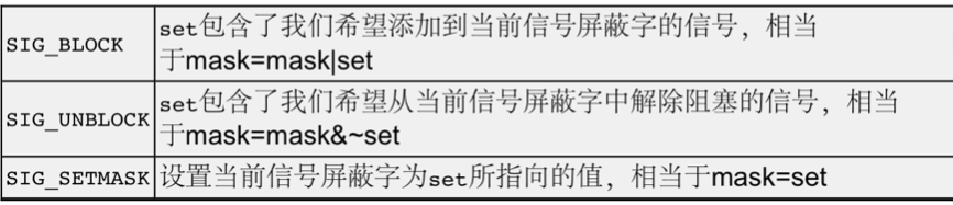 如果oset是非空指针,则读取进程的当前信号屏蔽字通过oset参数传出。如果set是非空指针,则 更改进程的信号屏蔽字,参数how指示如何更改。如果oset和set都是非空指针,则先将原来的信号 屏蔽字备份到oset里,然后根据set和how参数更改信号屏蔽字。假设当前的信号屏蔽字为mask,下表说明了how参数的可选值: